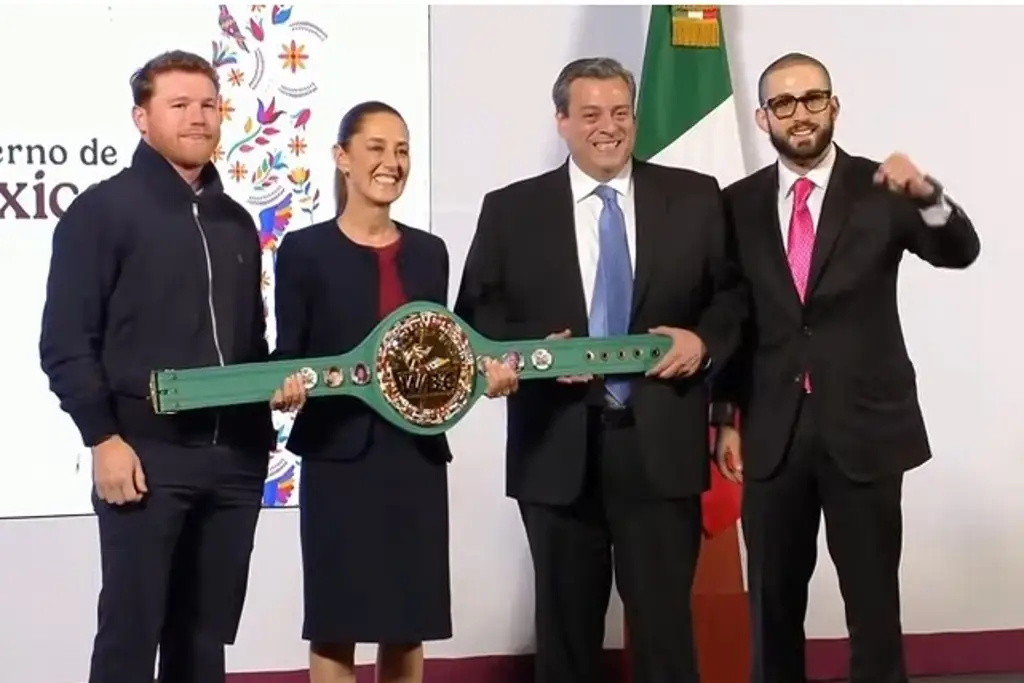 El boxeador Saúl Canelo Álvarez hizo una aparición inesperada en la conferencia de prensa matutina de la Presidenta Claudia Sheinbaum, donde le obsequió el cinturón de Campeona de las Mujeres y unos guantes que representan la paz.